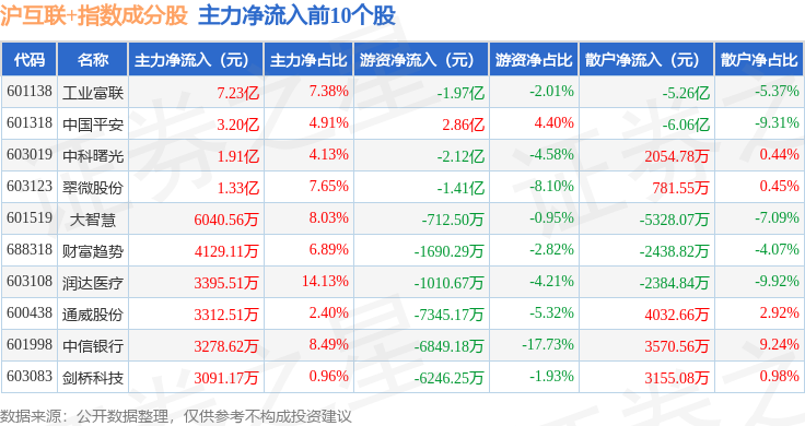 资金流向方面,沪互联+(000162)指数成份股当日主力资金净流入合计5.18亿元,游资资金净流出合计2.57亿元,散户资金净流出合计2.61亿元。成份股资金流向详情见下表:
