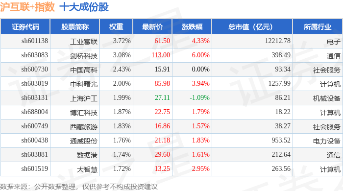 证券之星消息,12月17日,沪互联+(000162)指数报收于3546.15点,涨1.33%,成交509.15亿元,换手率1.11%。当日该指数成份股中,上涨的有59家,翠微股份以9.97%的涨幅领涨,下跌的有9家,恒银科技以2.1%的跌幅领跌。
