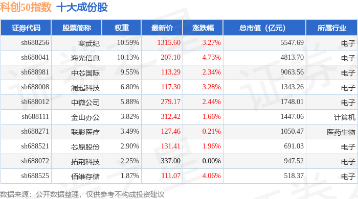 科创50(000688)指数十大成份股详情如下:
