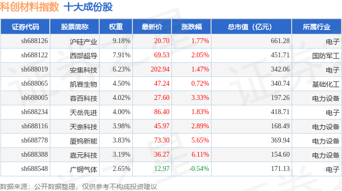 科创材料(000689)指数十大成份股详情如下: