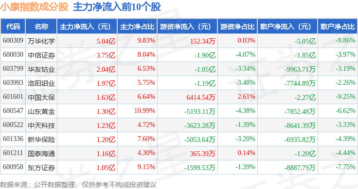 资金流向方面,小康指数(000901)成份股当日主力资金净流入合计21.68亿元,游资资金净流出合计22.78亿元,散户资金净流入合计1.1亿元。成份股资金流向详情见下表: