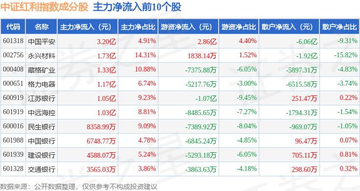 资金流向方面,中证红利(000922)指数成份股当日主力资金净流入合计7.73亿元,游资资金净流出合计6.56亿元,散户资金净流出合计1.11亿元。成份股资金流向详情见下表:
