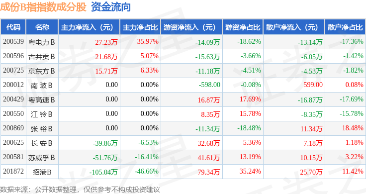 资金流向方面,成份B指(399003)指数成份股当日主力资金净流出合计132.05万元,游资资金净流入合计126.55万元,散户资金净流入合计5.5万元。成份股资金流向详情见下表: