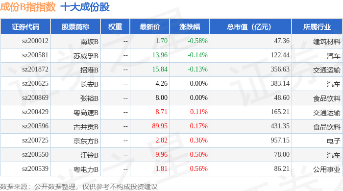 成份B指(399003)指数十大成份股详情如下:
