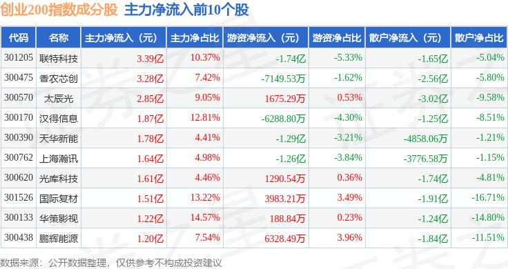 资金流向方面,创业200(399019)指数成份股当日主力资金净流出合计2.94亿元,游资资金净流出合计7.64亿元,散户资金净流入合计10.58亿元。成份股资金流向详情见下表: