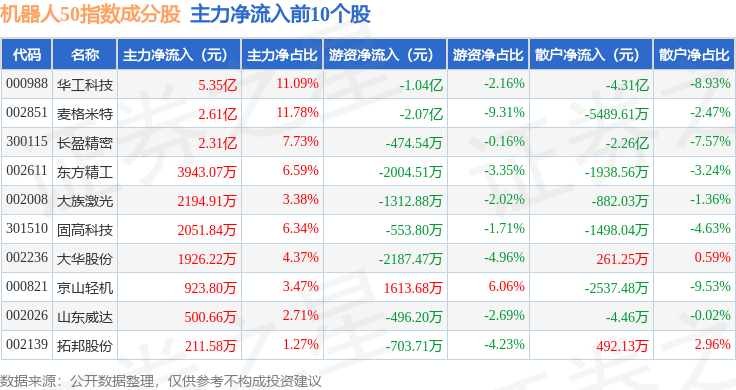 资金流向方面,机器人50(399283)指数成份股当日主力资金净流入合计2.49亿元,游资资金净流出合计3.29亿元,散户资金净流入合计8024.89万元。成份股资金流向详情见下表: