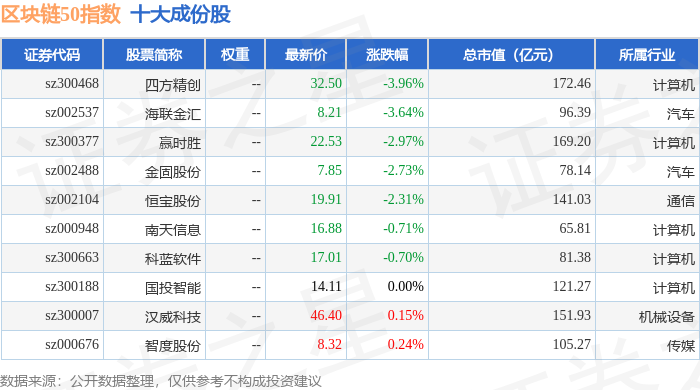 证券之星消息,12月17日,区块链50(399286)指数报收于3916.42点,涨1.55%,成交465.17亿元,换手率2.3%。当日该指数成份股中,上涨的有42家,汉得信息以5.9%的涨幅领涨,下跌的有7家,四方精创以3.96%的跌幅领跌。