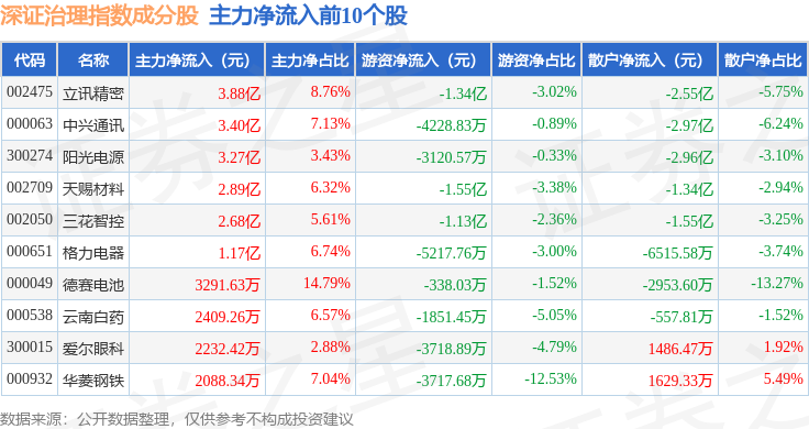 资金流向方面,深证治理(399328)指数成份股当日主力资金净流入合计9.99亿元,游资资金净流出合计6.83亿元,散户资金净流出合计3.17亿元。成份股资金流向详情见下表: