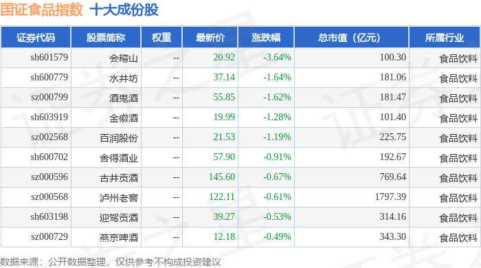 国证食品(399396)指数十大成份股详情如下: