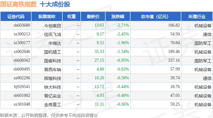 证券之星消息,12月17日,国证高铁(399419)指数报收于2057.46点,涨0.81%,成交125.31亿元,换手率0.68%。当日该指数成份股中,上涨的有35家,明泰铝业以4.09%的涨幅领涨,下跌的有12家,今创集团以2.71%的跌幅领跌。