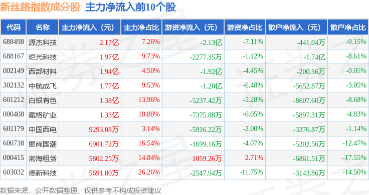 资金流向方面,新丝路(399429)指数成份股当日主力资金净流入合计5.8亿元,游资资金净流出合计13.51亿元,散户资金净流入合计7.62亿元。成份股资金流向详情见下表: