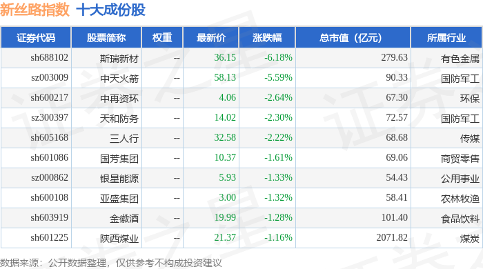 新丝路(399429)指数十大成份股详情如下: