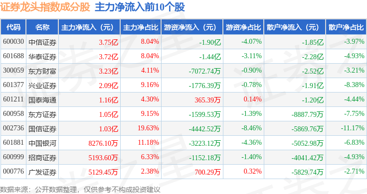 资金流向方面,证券龙头(399437)指数成份股当日主力资金净流入合计19.2亿元,游资资金净流出合计6.13亿元,散户资金净流出合计13.07亿元。成份股资金流向详情见下表: