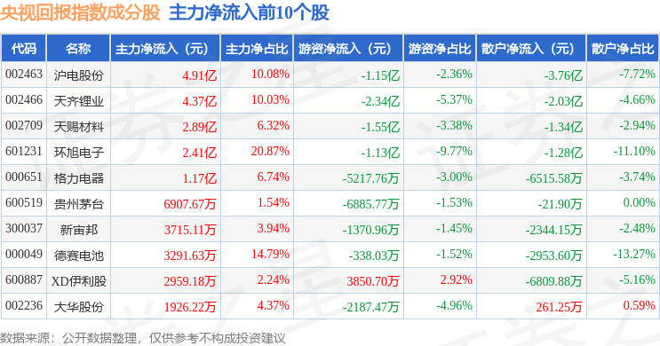 资金流向方面,央视回报(399553)指数成份股当日主力资金净流入合计6.92亿元,游资资金净流出合计7.56亿元,散户资金净流入合计6428.89万元。成份股资金流向详情见下表: