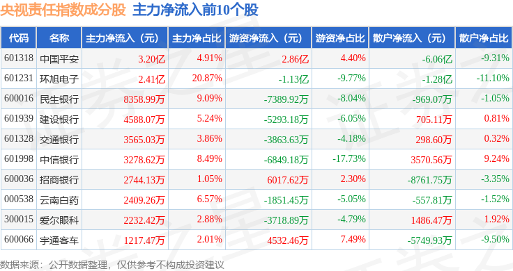 资金流向方面,央视责任(399555)指数成份股当日主力资金净流出合计20.34亿元,游资资金净流入合计6.84亿元,散户资金净流入合计13.51亿元。成份股资金流向详情见下表: