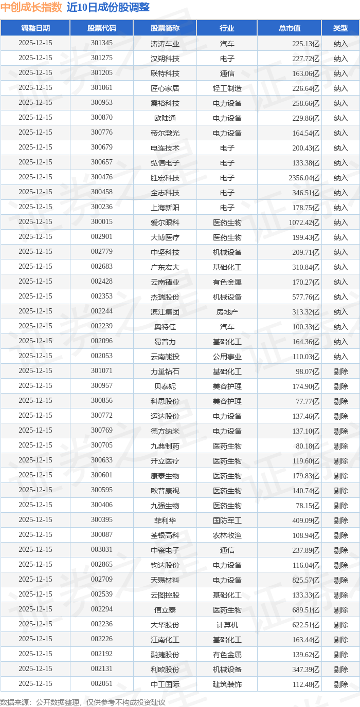 近10日内中创成长(399626)指数成份股做了调整,新纳入了22只股票,剔除了22只股票。