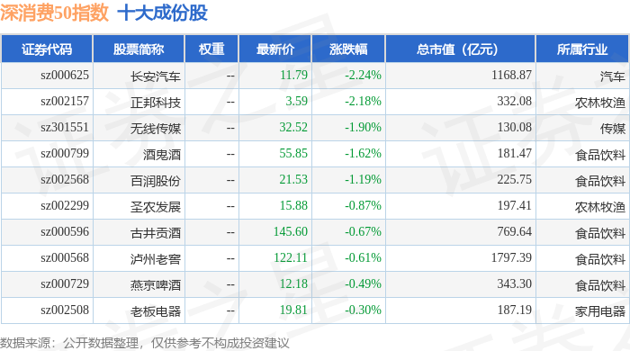 资金流向方面,深消费50(399646)指数成份股当日主力资金净流入合计142.95万元,游资资金净流出合计3.97亿元,散户资金净流入合计3.95亿元。成份股资金流向详情见下表: