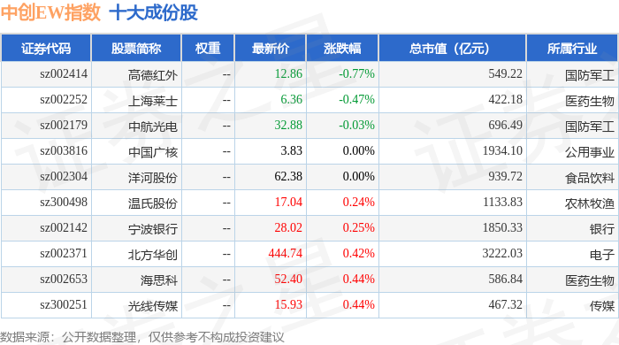 证券之星消息,12月17日,中创EW(399660)指数报收于2687.13点,涨2.57%,成交2136.54亿元,换手率1.32%。当日该指数成份股中,上涨的有95家,深南电路以10.0%的涨幅领涨,下跌的有3家,高德红外以0.77%的跌幅领跌。
