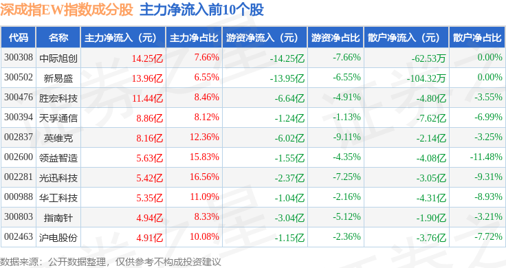 资金流向方面,深成指EW(399659)指数成份股当日主力资金净流入合计128.49亿元,游资资金净流出合计114.83亿元,散户资金净流出合计13.66亿元。成份股资金流向详情见下表: