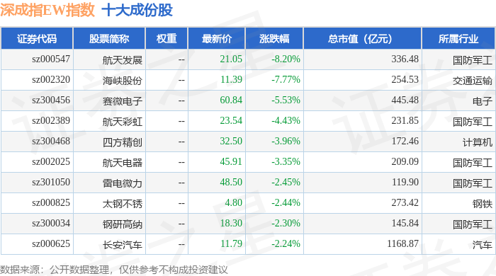 证券之星消息,12月17日,深成指EW(399659)指数报收于4563.4点,涨1.7%,成交4910.09亿元,换手率1.63%。当日该指数成份股中,上涨的有421家,天华新能以14.45%的涨幅领涨,下跌的有68家,航天发展以8.2%的跌幅领跌。