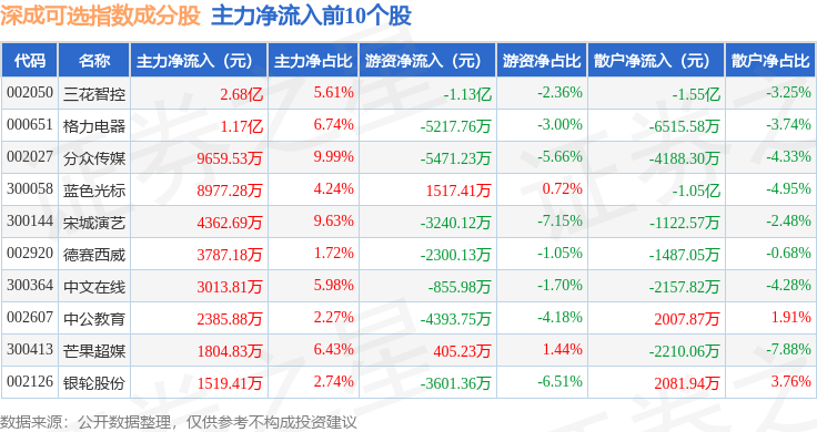 资金流向方面,深成可选(399683)指数成份股当日主力资金净流入合计2.8亿元,游资资金净流出合计4.44亿元,散户资金净流入合计1.64亿元。成份股资金流向详情见下表: