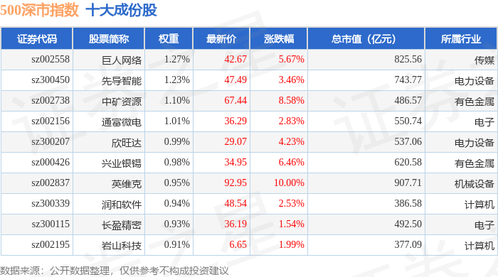 500深市(399802)指数十大成份股详情如下: