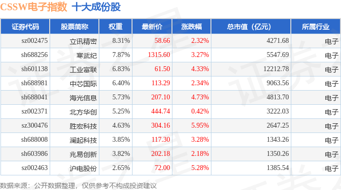 CSSW电子(399811)指数十大成份股详情如下: