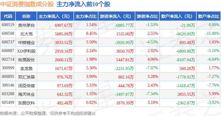 资金流向方面,中证消费(399932)指数成份股当日主力资金净流出合计2.94亿元,游资资金净流出合计733.68万元,散户资金净流入合计3.02亿元。成份股资金流向详情见下表: