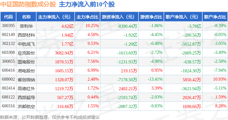 资金流向方面,中证国防(399973)指数成份股当日主力资金净流出合计26.56亿元,游资资金净流入合计1.11亿元,散户资金净流入合计25.45亿元。成份股资金流向详情见下表: