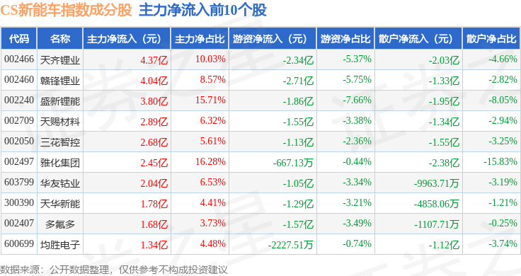 资金流向方面,CS新能车(399976)指数成份股当日主力资金净流入合计28.22亿元,游资资金净流出合计19.63亿元,散户资金净流出合计8.23亿元。成份股资金流向详情见下表: