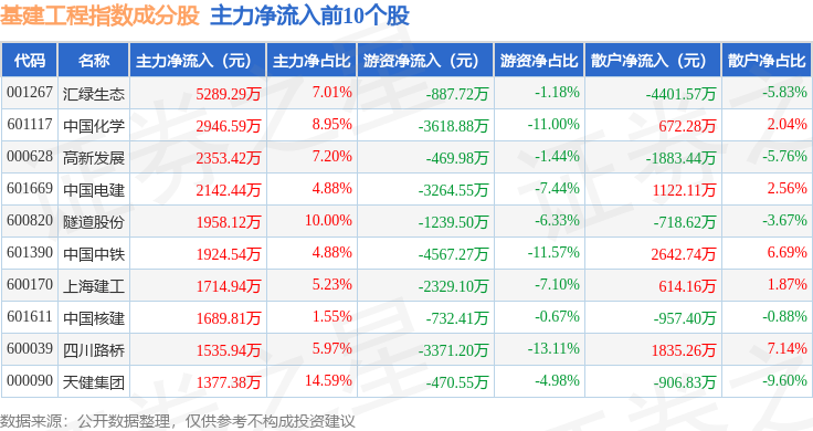 资金流向方面,基建工程(399995)指数成份股当日主力资金净流出合计2.15亿元,游资资金净流出合计2.71亿元,散户资金净流入合计4.86亿元。成份股资金流向详情见下表: