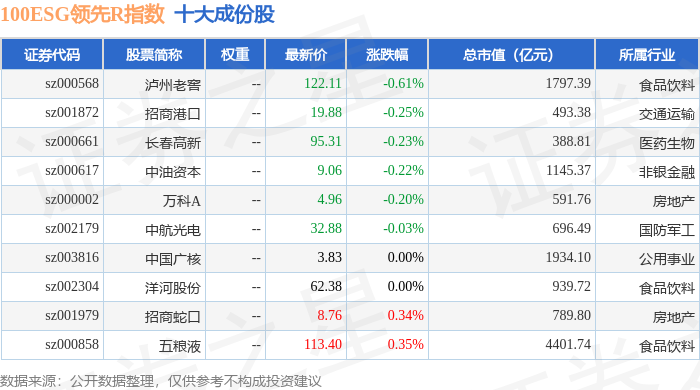 证券之星消息,12月17日,100ESG领先R(470030)指数报收于9142.32点,涨2.24%,成交1088.65亿元,换手率1.16%。当日该指数成份股中,上涨的有42家,深南电路以10.0%的涨幅领涨,下跌的有6家,泸州老窖以0.61%的跌幅领跌。