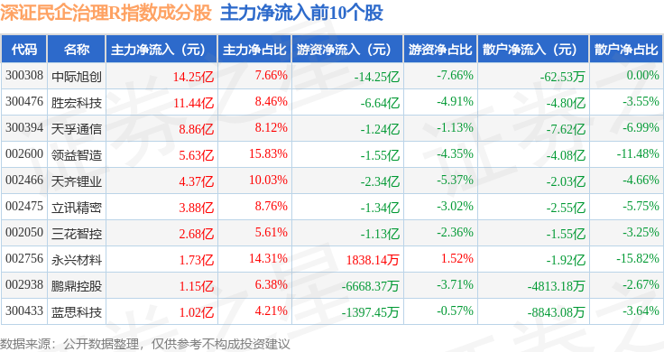 资金流向方面,深证民企治理R(470058)指数成份股当日主力资金净流入合计50.75亿元,游资资金净流出合计33.42亿元,散户资金净流出合计17.33亿元。成份股资金流向详情见下表:
