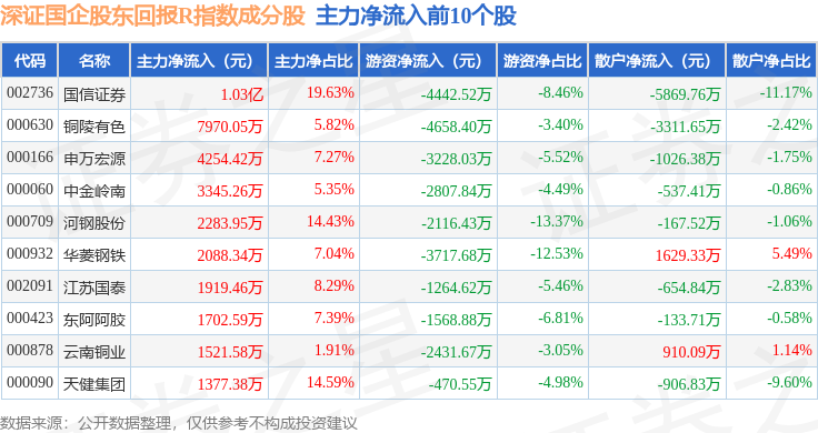 资金流向方面,深证国企股东回报R(470064)指数成份股当日主力资金净流出合计6.45亿元,游资资金净流出合计2.81亿元,散户资金净流入合计9.26亿元。成份股资金流向详情见下表: