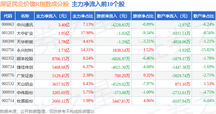 资金流向方面,深证民企价值R(470072)指数成份股当日主力资金净流入合计9.64亿元,游资资金净流出合计5.08亿元,散户资金净流出合计4.56亿元。成份股资金流向详情见下表: