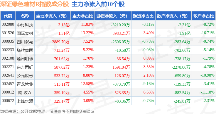 资金流向方面,深证绿色建材R(470077)指数成份股当日主力资金净流入合计4.18亿元,游资资金净流出合计2291.61万元,散户资金净流出合计3.95亿元。成份股资金流向详情见下表: