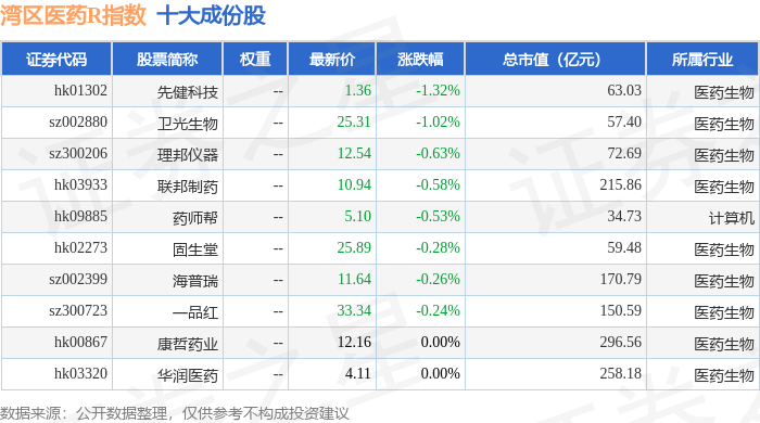 湾区医药R(480013)指数十大成份股详情如下:
