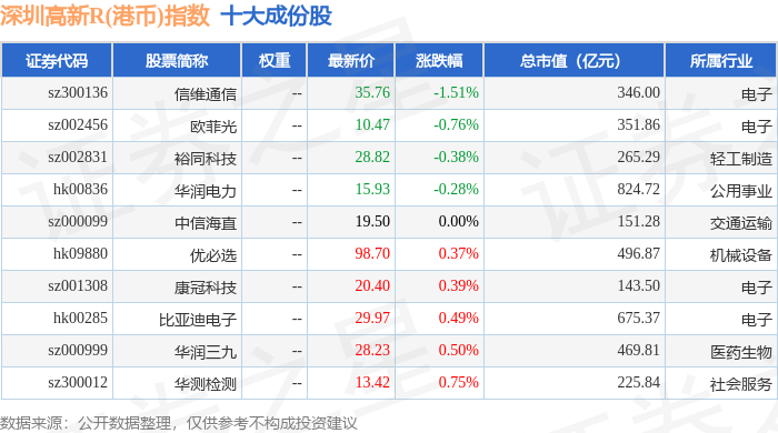深圳高新R(港币)(480039)指数十大成份股详情如下: