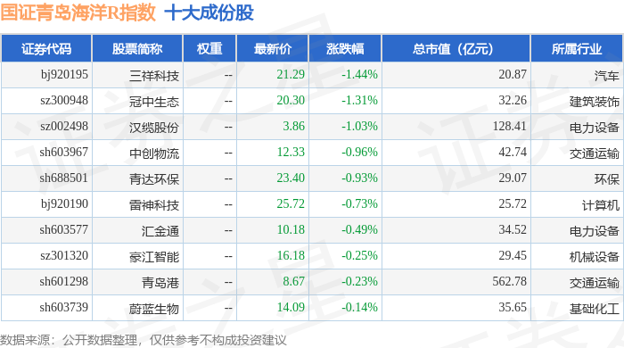 国证青岛海洋R(480532)指数十大成份股详情如下: