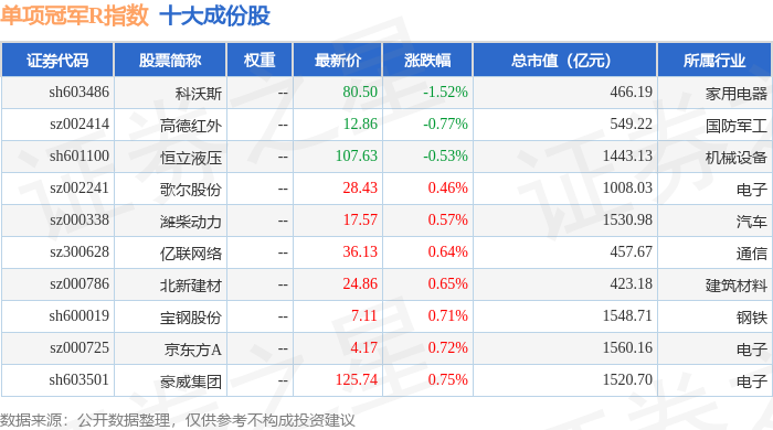 近10日内单项冠军R(480150)指数成份股做了调整,新纳入了5只股票,剔除了5只股票。