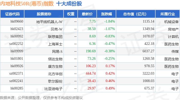 内地科技50R(港币)(483004)指数十大成份股详情如下: