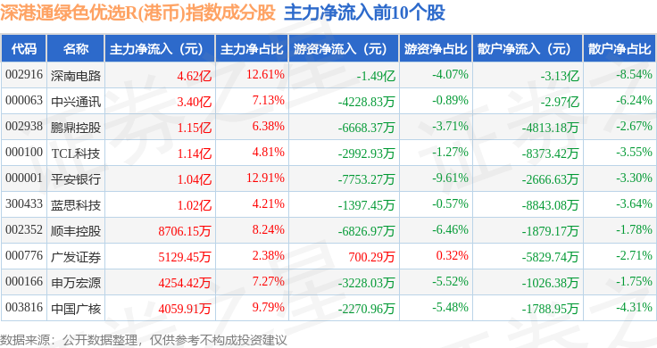 资金流向方面,深港通绿色优选R(港币)(483012)指数成份股当日主力资金净流入合计3.08亿元,游资资金净流出合计7.4亿元,散户资金净流入合计4.32亿元。成份股资金流向详情见下表: