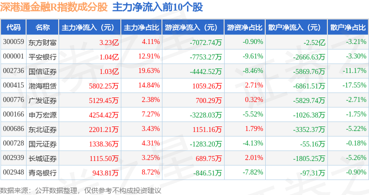 资金流向方面,深港通金融R(483025)指数成份股当日主力资金净流入合计4.9亿元,游资资金净流出合计6719.92万元,散户资金净流出合计4.23亿元。成份股资金流向详情见下表:
