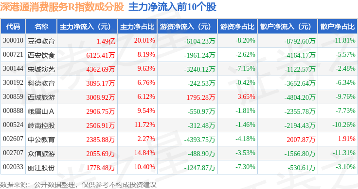 资金流向方面,深港通消费服务R(483045)指数成份股当日主力资金净流入合计2.8亿元,游资资金净流出合计1.63亿元,散户资金净流出合计1.17亿元。成份股资金流向详情见下表: