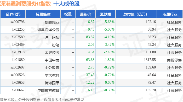深港通消费服务R(483045)指数十大成份股详情如下: