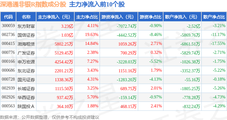 资金流向方面,深港通非银R(483053)指数成份股当日主力资金净流入合计4.04亿元,游资资金净流入合计1362.86万元,散户资金净流出合计4.17亿元。成份股资金流向详情见下表: