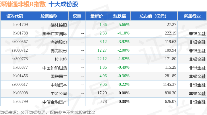 证券之星消息,12月17日,深港通非银R(483053)指数报收于9012.34点,涨1.63%,成交297.56亿元,换手率0.81%。当日该指数成份股中,上涨的有49家,中国人寿以4.31%的涨幅领涨,下跌的有8家,德林控股以5.66%的跌幅领跌。