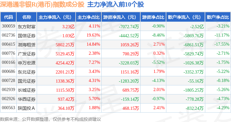 资金流向方面,深港通非银R(港币)(483054)指数成份股当日主力资金净流入合计4.04亿元,游资资金净流入合计1362.86万元,散户资金净流出合计4.17亿元。成份股资金流向详情见下表: