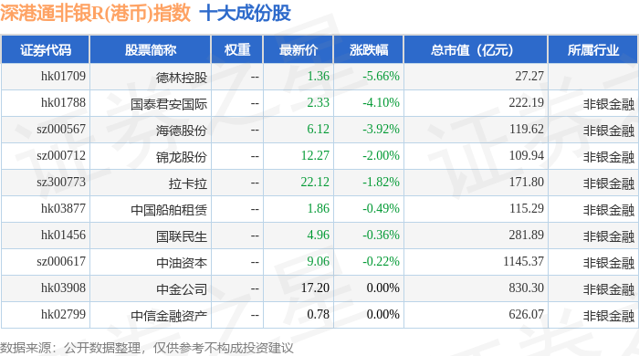 深港通非银R(港币)(483054)指数十大成份股详情如下:
