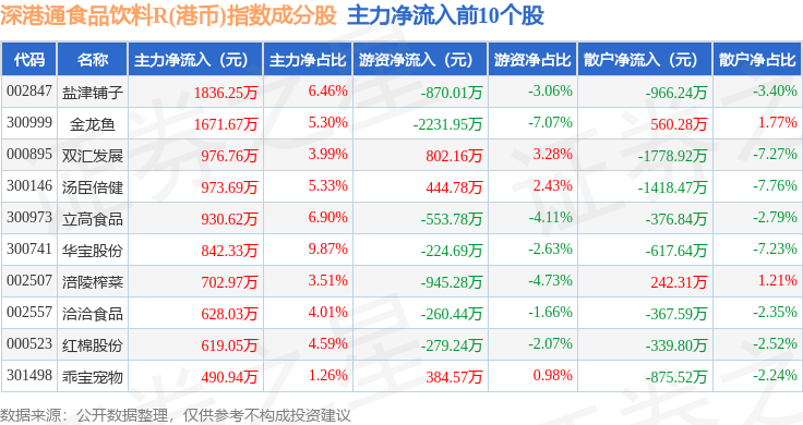 资金流向方面,深港通食品饮料R(港币)(483066)指数成份股当日主力资金净流出合计3.54亿元,游资资金净流出合计6964.07万元,散户资金净流入合计4.24亿元。成份股资金流向详情见下表: